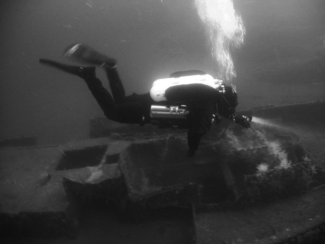 Cirka 30 meter på bagbord side (bunden). Du rammer masten på cirka 24 meter. Kun for avancerede dykkere. Pas på dybderuset! (he, he).